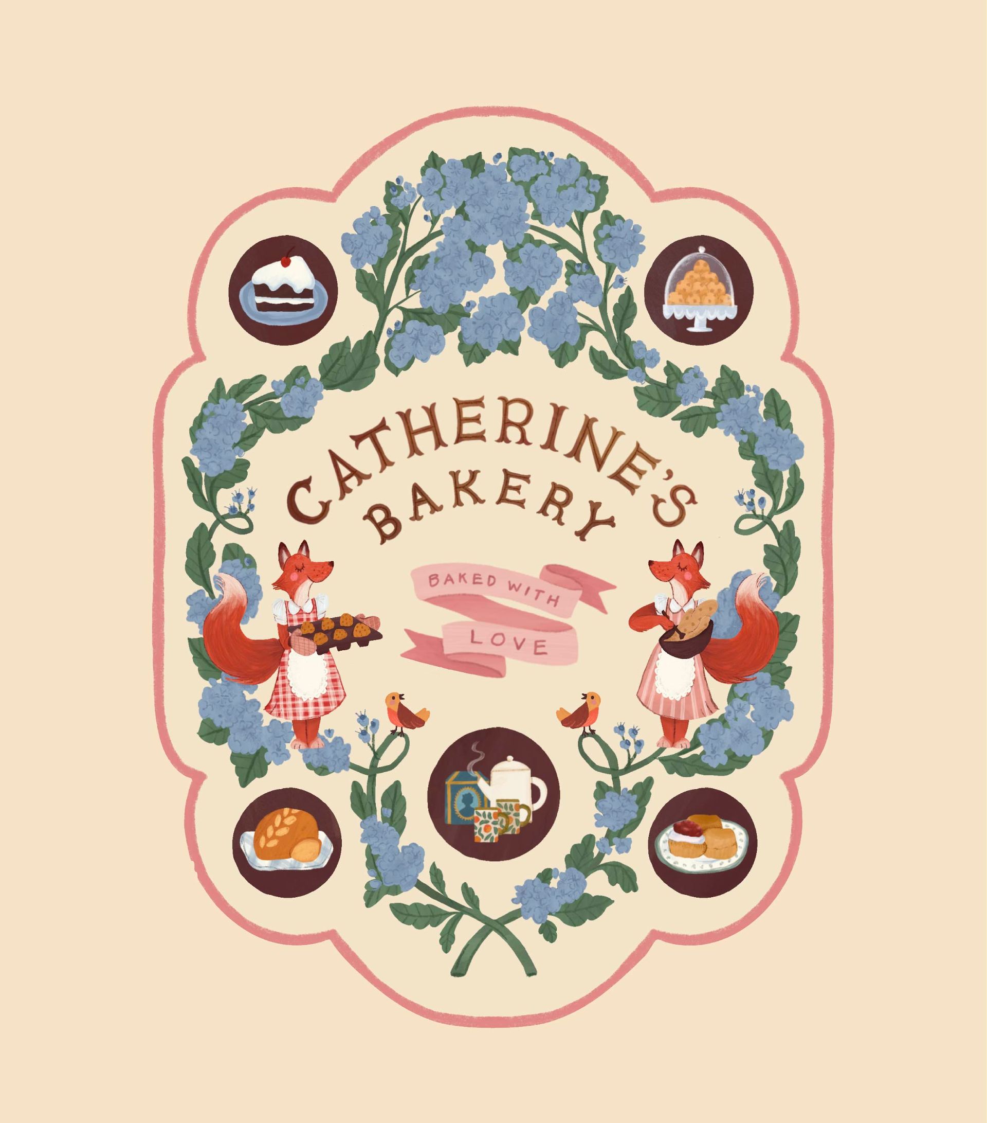 Designed a bespoke illustrated label for Catherine’s Bakery, a small-batch bakery brand. The piece features hand-rendered lettering paired with a collection of custom illustrations—including florals, woodland animals, and baked goods—woven together in a storybook-inspired composition.